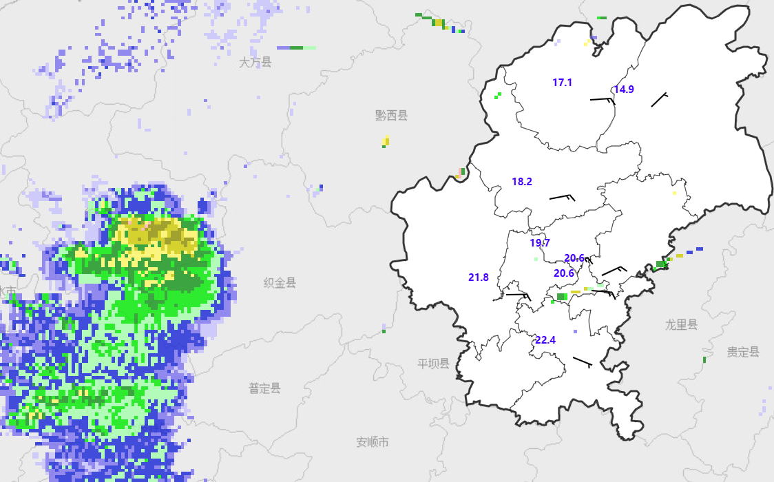 目前,雷雨云团主体已位于织金县西北部和普定县,当雷雨云团影响贵阳市后首先会影响清镇市新店、流长、犁倭一带的居民,在雷雨中可能出现冰雹。