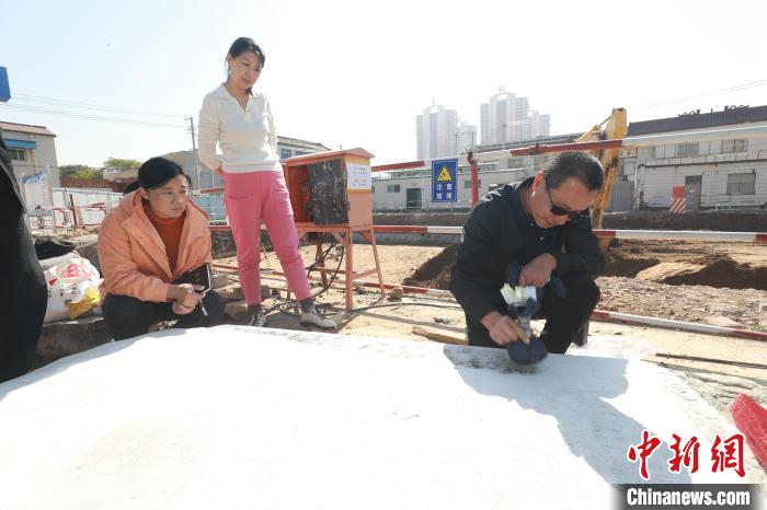 图为工作人员对碑刻进行拓印。(摄影:沈齐)