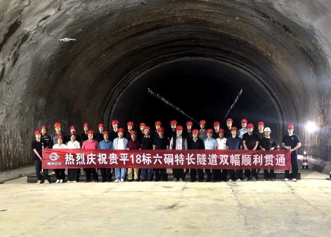 六硐特长隧道作为贵平高速全线第一长隧道,全长4050米,位于黔南州平塘县喀斯特地貌核心区,隧道穿越82个大小溶洞、岩溶地段等复杂地质体,更有深达220米、空腔容积约达30万立方米的超大溶洞,每一米的掘进都伴随着技术与自然的激烈博弈。面临岩溶发育、岩体破碎、节理裂隙发育、围岩稳定性差、涌水量大等难题,贵平T18标以“党建+安全”“党建+质量”双轮驱动,组建“党员先锋队”和“青年岗”,昼夜攻坚38天完成溶洞治理,攻克多项岩溶地区隧道建设难题。攻坚克难的背后,是“岩溶地区大断面隧道涌沙处治插板法施工工法+双层初期支护”组合工艺的首次应用,这项创新技术成功化解了古暗河段500米脆弱地层的涌沙突泥风险。经历6个月的艰苦奋战,项目建设团队成功克服了涌水、突泥等难题,确保了隧道施工的安全与质量。六硐特长隧道已于2025年5月实现双幅贯通。