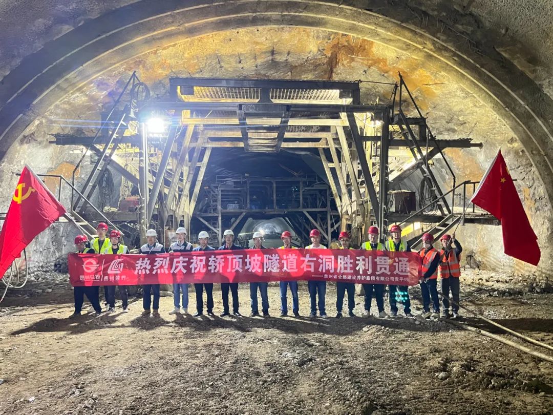 轿顶坡隧道左幅隧道全长1005米,右幅隧道全长1000米,针对隧道开挖过程中遭遇的不良地质问题,项目部严格遵循“短进尺、弱爆破、强支护、快封闭、勤量测、稳推进”的施工原则,综合运用超前水平钻探、TSP超前地质预报等技术手段,提前研判掌子面前方地质状况,通过超前预注浆加固、径向注浆处理及永久排水设施建设等措施,同时强化安全技术交底和班前教育,严格落实“安全吹哨人”制度以及值班值守等安全管控措施,有效保障了岩溶段施工安全。轿顶坡隧道已于2025年5月实现双幅贯通。