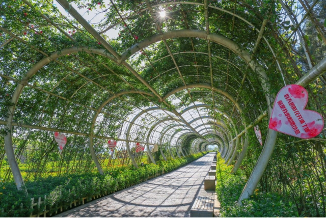 用心形钢材搭建成的爱情长廊,两侧种有三角梅、紫藤、蔷薇,灯笼花,炮仗花等多种藤蔓植物,待各种植物爬满廊架之时,恋人十指相扣走过长廊,享受着爱情带来的点点浪漫时光,惬意之至。
