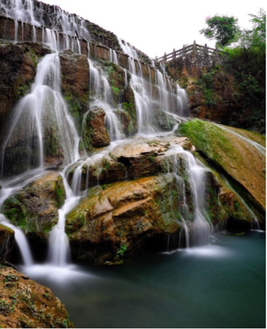 在景区内有一条纳古河,河流细狭而悠长,河水如同一块碧玉,静谧而又幽静,仿佛进入了世外桃源。阳光照在河面上波光粼粼,不禁让人想起了一首诗“水光敛滟晴方好,山色空蒙雨亦奇”。河岸边可沿着滨河木栈道游览小河风光,两岸“竹树环合”,美似人间仙境。深幽河谷瀑布跌宕,横跨纳古河两岸有松林桥、风雨桥、畏因桥、糊涂桥。