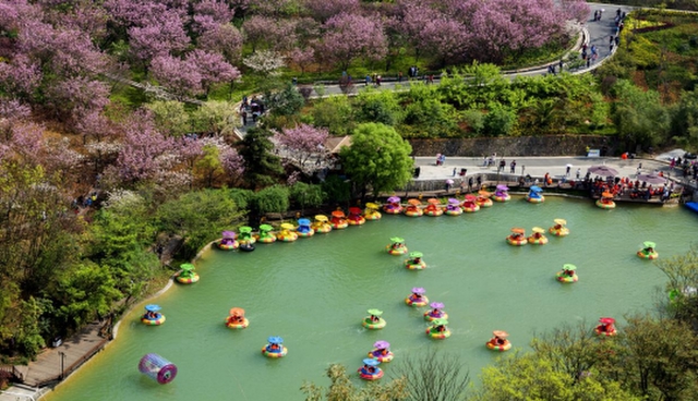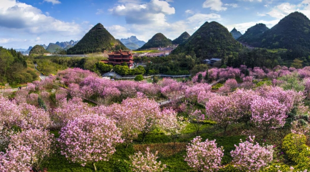 这里有黔西南州面积最大的樱花园,寒冬初过,大地苏醒,阳光洒向大地,嫩绿的枝叶开始发芽,这时的樱花林,已是春意上枝头,花开成海。