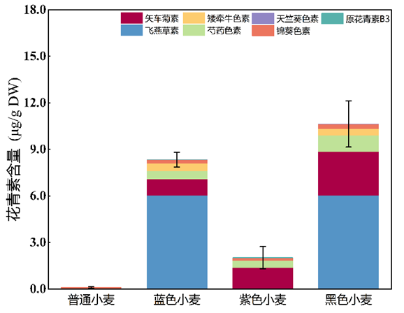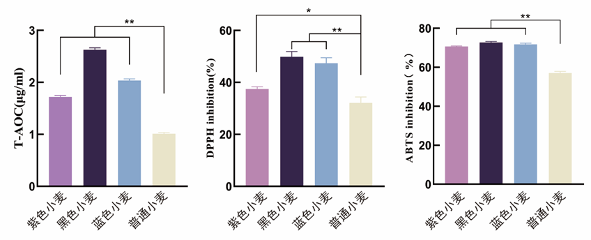彩色小麦籽粒内淀粉、蛋白质、脂肪、维生素、矿物质等含量与普通小麦相似,因此它具备了普通小麦的营养功能。但彩色小麦的独特之处在于其种皮或糊粉层内积聚了丰富的天然花青素,具有抗氧化、消炎、抗菌等特性,能够消除体内自由基,提高免疫力,抑制癌细胞生长等,同时还具有预防糖尿病,防止肥胖,保护视力等保健功能。我们从不同类型彩色小麦提取出了相应的花青素,比较了它们之间的体外抗氧化能力。结果表明,彩色小麦抗氧化能力均显著高于普通小麦品种,以黑色小麦最高,蓝色小麦次之,紫色小麦最低(图3)。