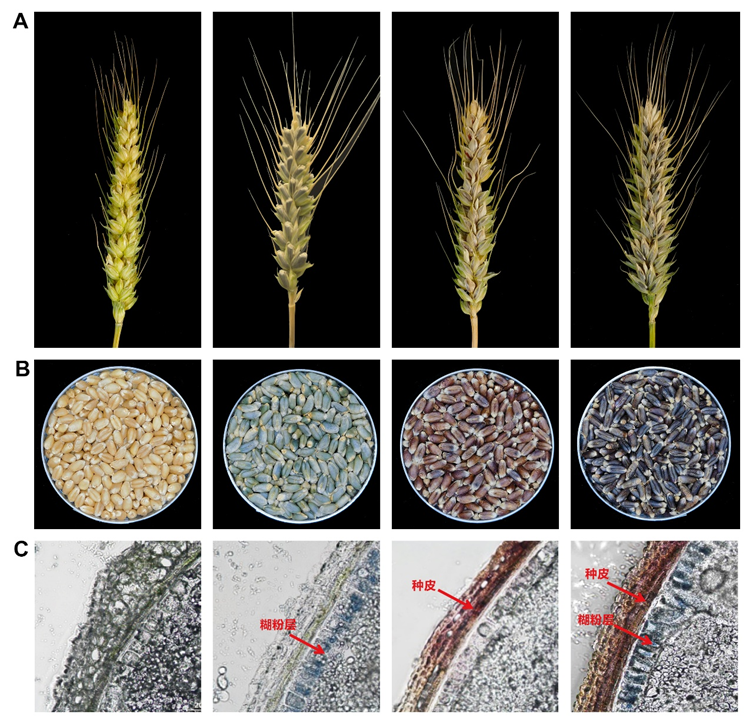 小麦(Triticum aestivum L.)是我国两大口粮作物之一,在保障国家粮食安全中发挥了极其重要的战略地位。常见的小麦籽粒颜色以白粒、黄粒和红粒为主,近年来,一类特殊粒色的新型小麦——彩色小麦逐渐进入人们的视野(图1A,B)。彩色小麦是指籽粒呈现自然非传统颜色(紫色、蓝色、黑色等)的小麦品种,这类小麦不仅具有独特的外观,还富含花青素等生物活性物质,在功能食品和农业多样化发展中具有重要潜力。