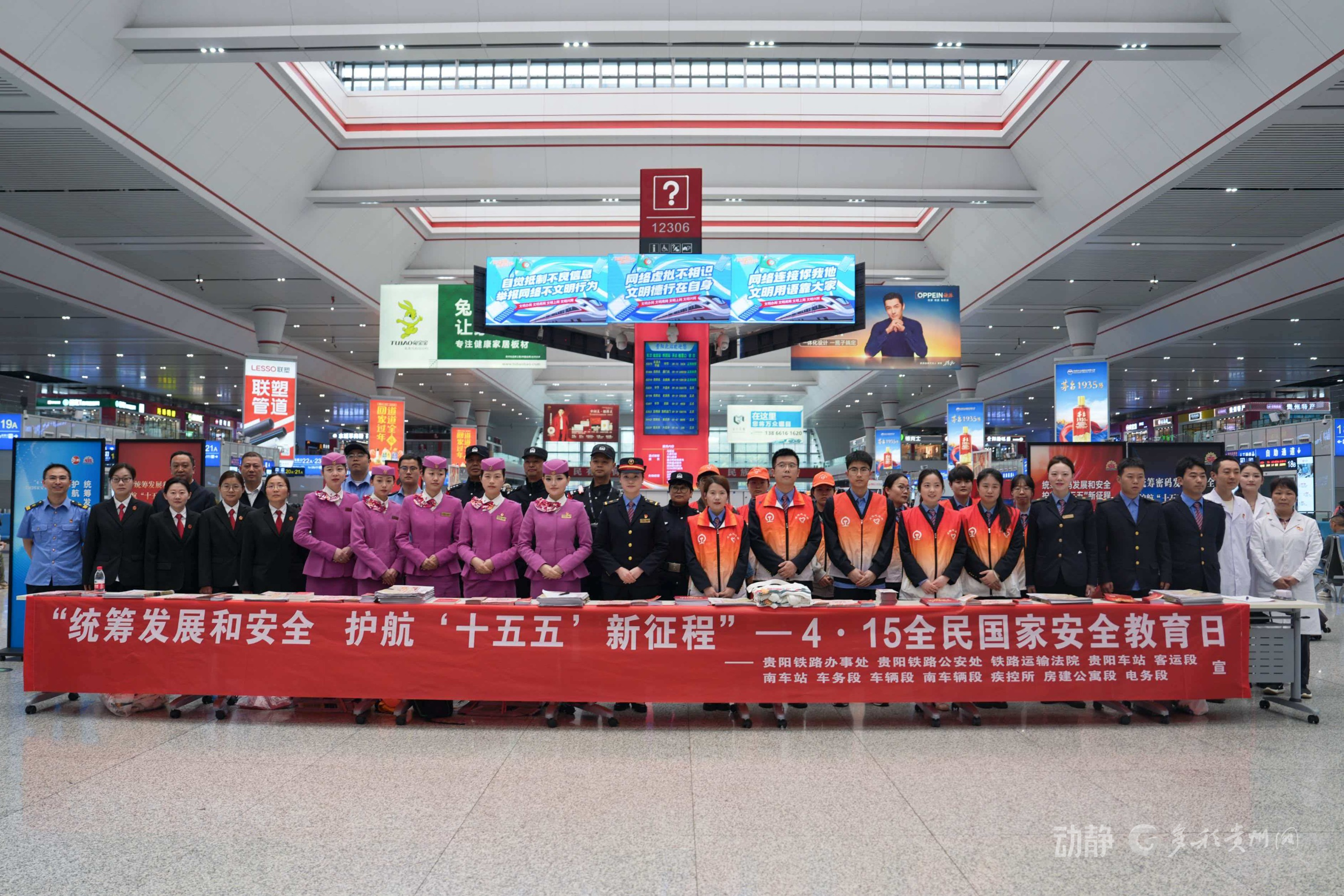 4月15日是第11个全民国家安全教育日。为深入贯彻总体国家安全观,紧扣“统筹发展和安全 护航‘十五五’新征程”主题,贵阳铁路办事处牵头,联合贵阳铁路公安处、铁路运输法院、贵阳车站、贵阳房建公寓段、贵阳南车辆段等12家铁路单位,组织40余名青年志愿者,在贵阳北站候车室集中开展主题宣传活动,把国家安全与铁路安全知识送到旅客身边,共筑安全防线。