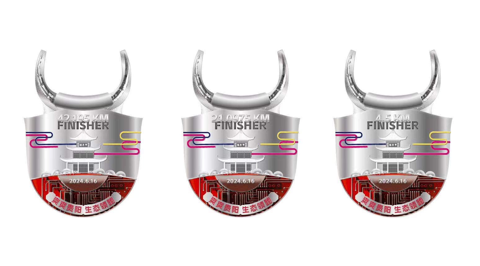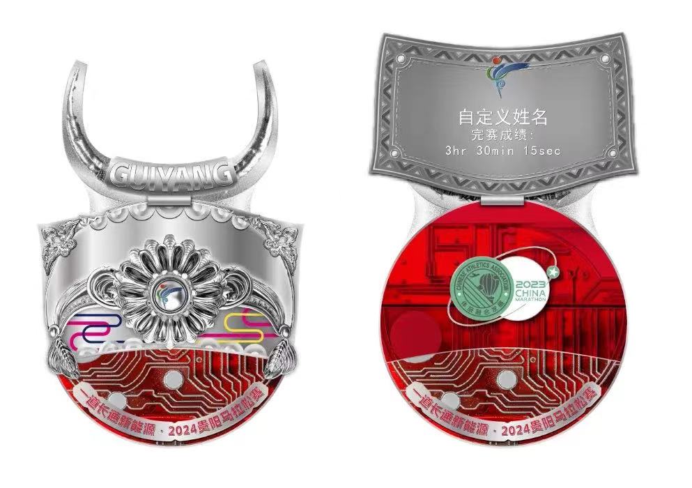贵马完赛奖牌正面采用苗族银饰头冠的经典造型,以浮雕形式呈现,细致地刻画出苗族银饰的纹理和图案,展现出浓郁的民族风情。不仅是一枚马拉松奖牌,更是贵阳文化与科技融合的缩影。它不仅纪念了跑者的坚持与汗水,也展示了贵阳作为历史文化名城与现代科技都市的双重魅力。通过这样的设计,贵阳马拉松奖牌将成为连接传统与现代、民族与世界的桥梁,让每位参赛者都能感受到贵阳的独特魅力和马拉松运动的精神。