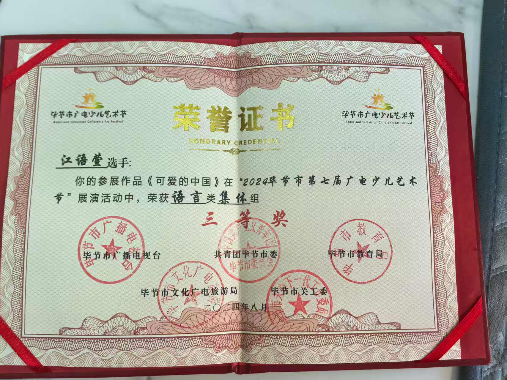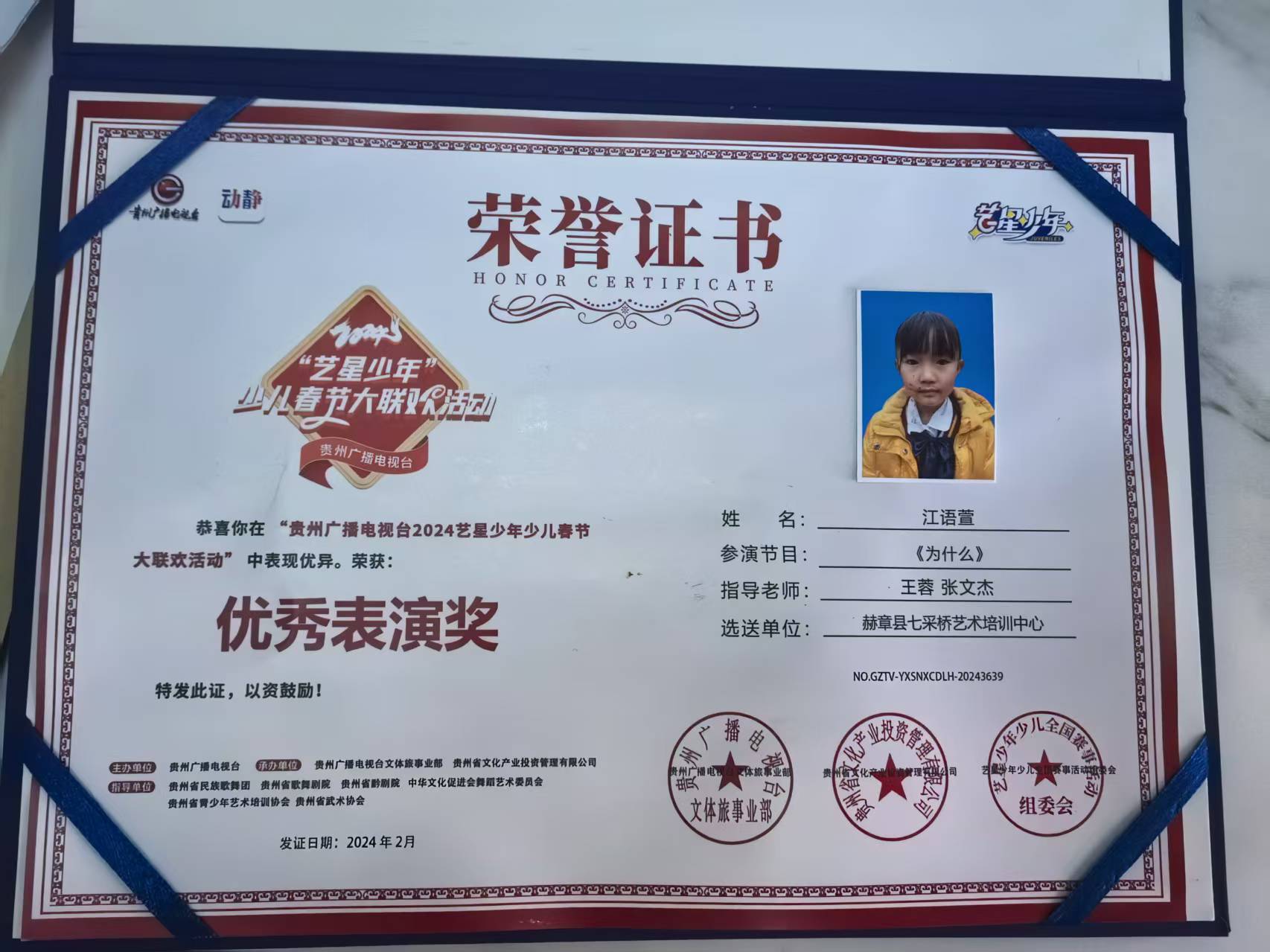 努力从不会被辜负。去年,江语萱在毕节市第七届广电少儿艺术节活动中荣获语言类集体组三等奖;她参与的《为什么》节目在贵州广播电视台2024艺星少年少儿春节大联欢活动中表现优异,荣获优秀表演奖。