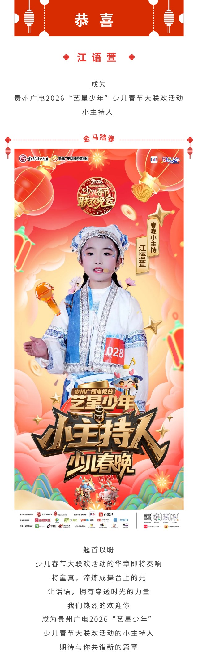江语萱 | 贵州广电2026“艺星少年”少儿春节大联欢活动小主持人!