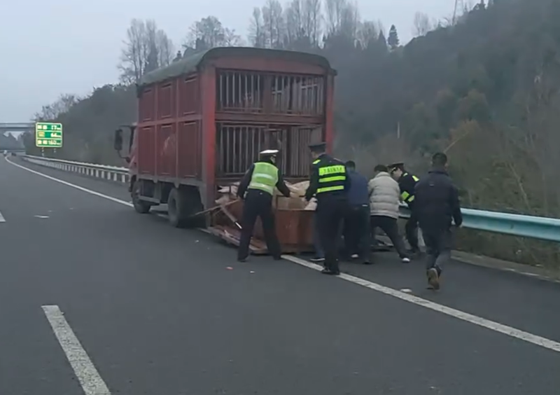 近日,毕节市公安交通管理局高速四大队指挥中心视频巡查发现,在G76厦蓉高速1600公里龙场收费站附近,一辆重型仓栅式货车发生侧翻,车上装载的生猪在高速公路上乱跑。