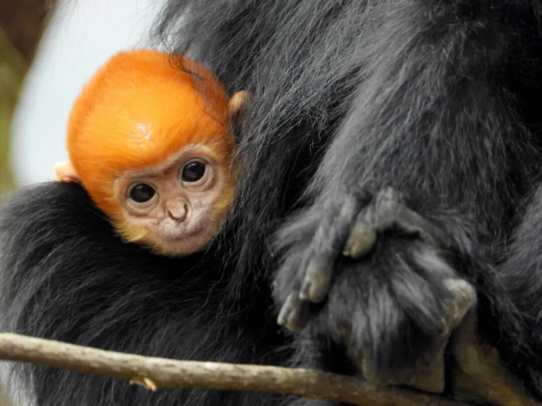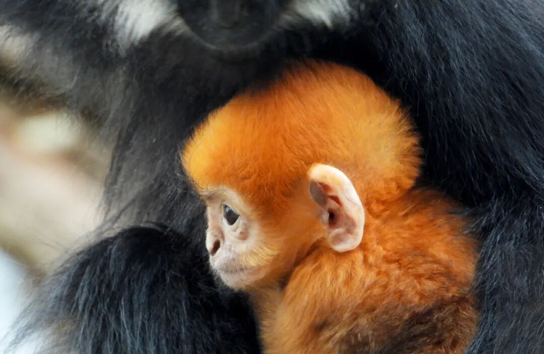据保护区科研人员介绍,雌性黑叶猴通常每胎产一仔,怀孕期约6个月。幼崽出生时体重约500克,主要依靠母乳成长,持续大半年。初生幼崽毛色呈金黄色,6月龄左右逐渐变黑;两侧白色颊毛在2月龄时初步长出(呈淡黄色),约1岁时转为纯白。
