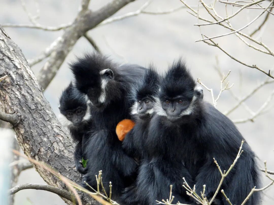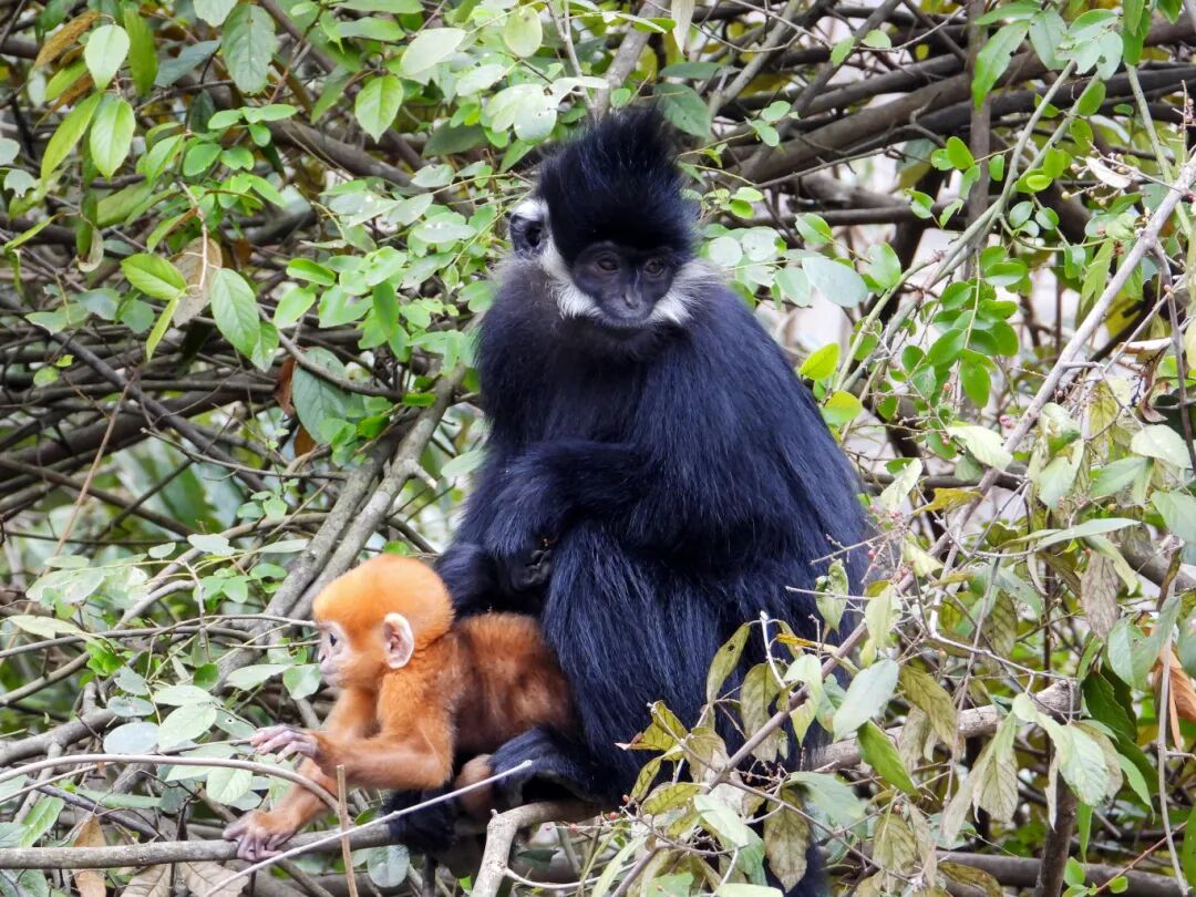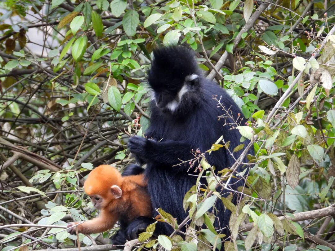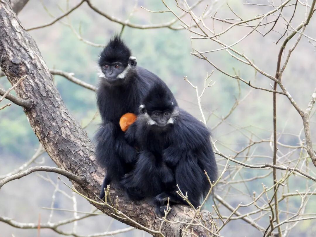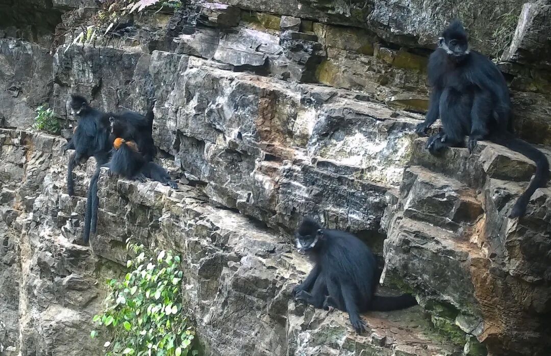 黑叶猴(Trachypithecus francoisi)是中国一级重点保护野生动物,被《世界自然保护联盟濒危物种红色名录》评估为“易危”(VU)等级。目前全球种群数量约为2100只,其中约1200只分布在贵州省。该物种体形纤瘦,四肢细长,头顶有黑色直立毛冠,以果实、种子和嫩芽为食。