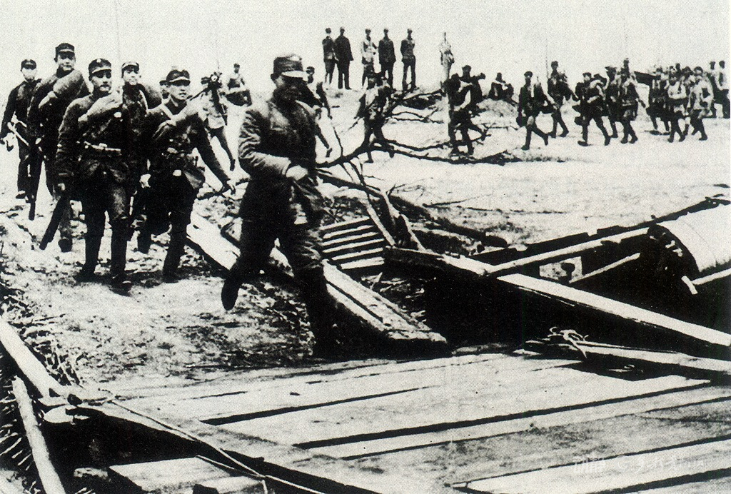 中国军队快步通过台儿庄外围