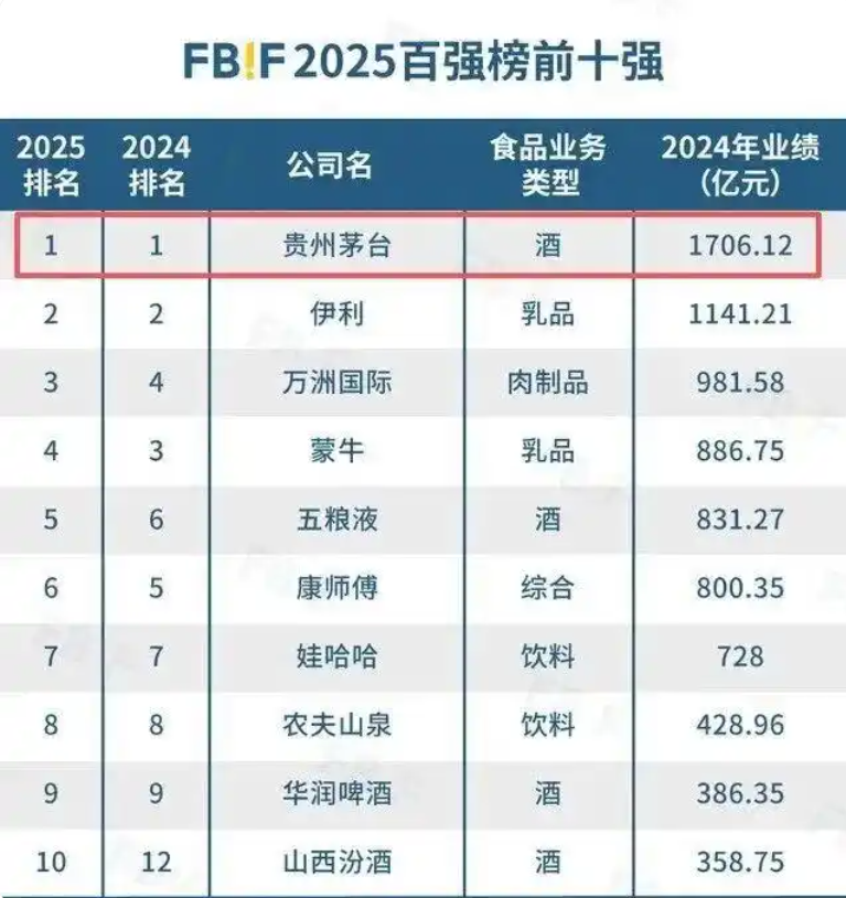 在近日发布的《2025中国食品饮料百强榜》中,贵州茅台以1706.12亿元的业绩位居榜首,是自2023年起的第三度蝉联。