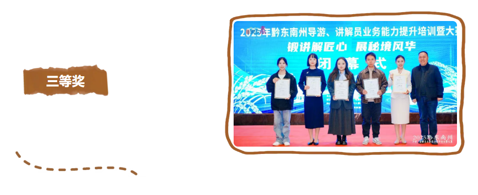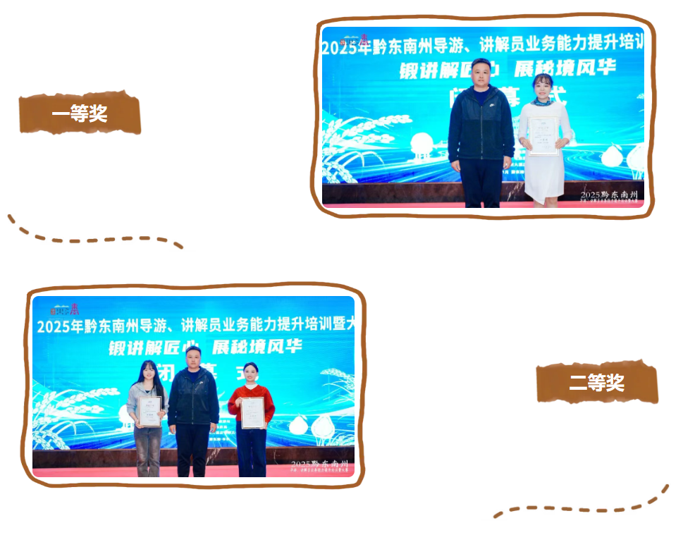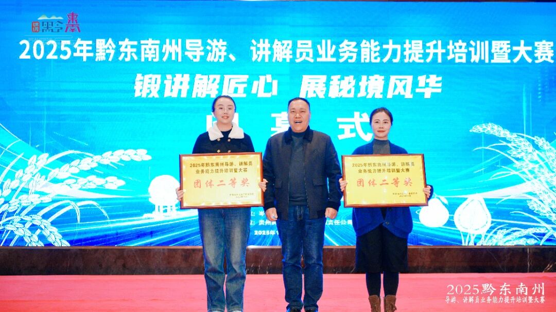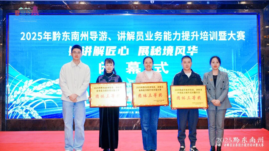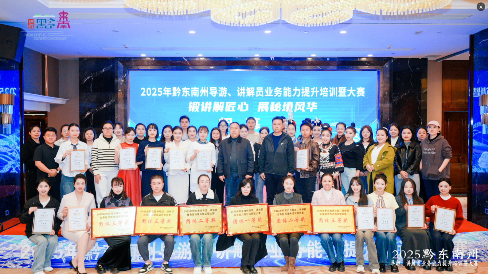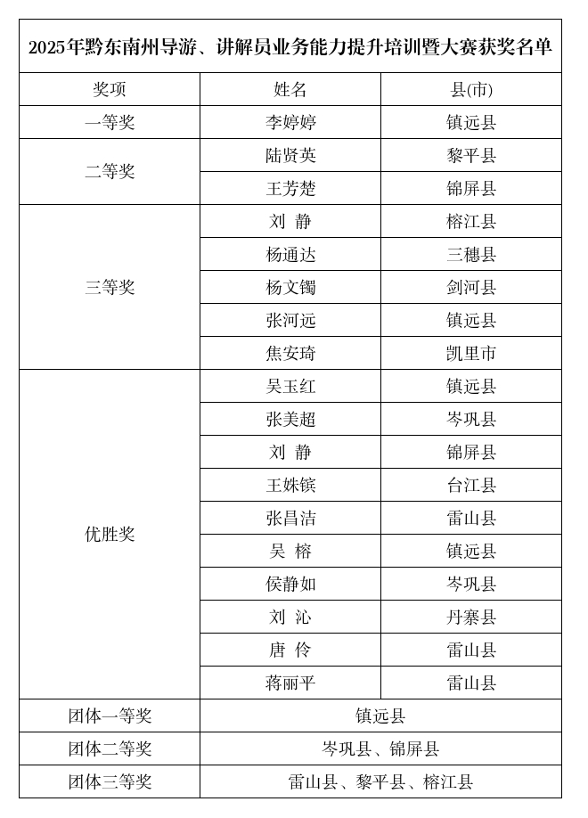 经过多轮激烈角逐与评委组的严格评审,镇远县李婷婷选手荣获2025年黔东南州导游、讲解员技能大赛一等奖,黎平县陆贤英、锦屏县王芳楚荣获二等奖,刘静、杨通达、杨文镯、张河远、焦安琦荣获三等奖;吴玉红、张美超等10位选手荣获优胜奖;镇远县荣获团体一等奖,锦屏县、岑巩县荣获团体二等奖,雷山县、黎平县、榕江县荣获团体三等奖。