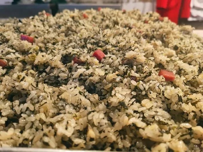 社饭起源于社日祭祀,用青蒿、糯米、大米、野葱、腊肉、干豆腐、花生等混合在一起制作而成。