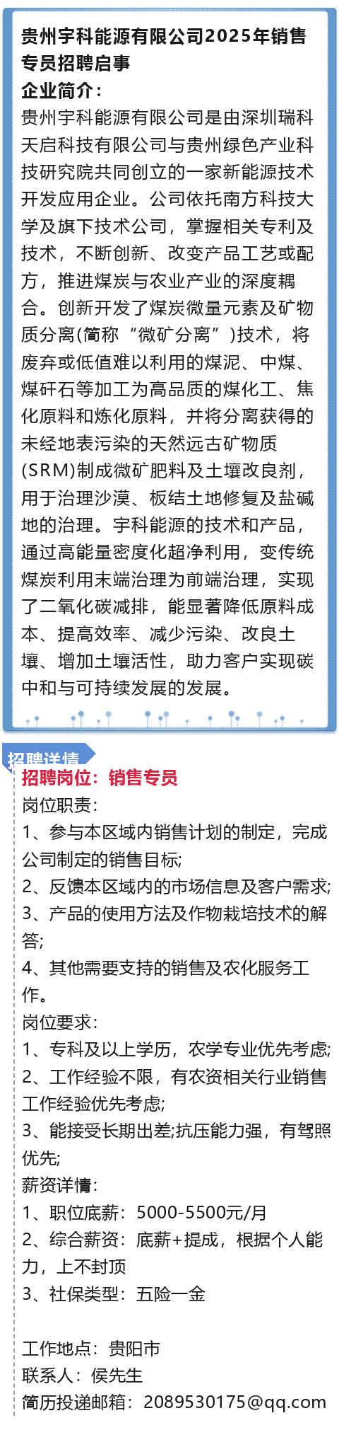 贵阳市招聘销售专员!底薪5000-5500元/月!五险一金!