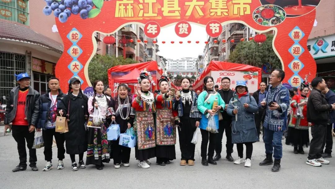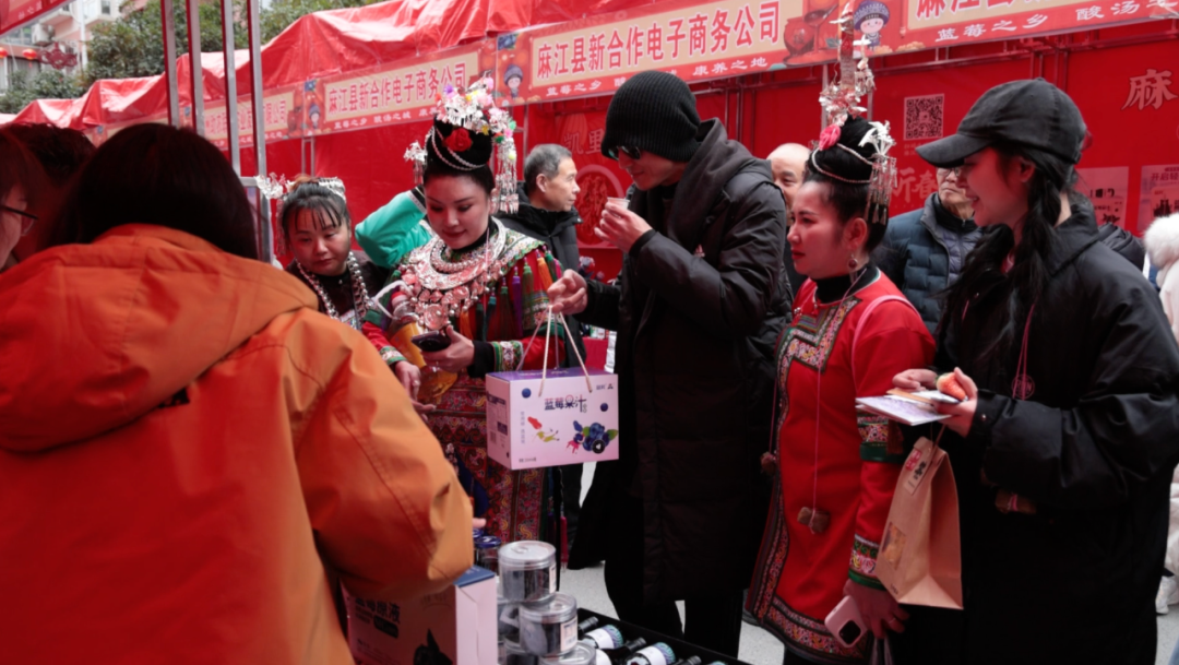 在年货集市现场,榕江与麻江两地新媒体团队紧密合作,通过短视频拍摄和直播带货助力麻江蓝莓、酸汤等特色产品销售。